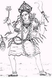 arms and carries in her four hands a sword or head chopper, a scissors,